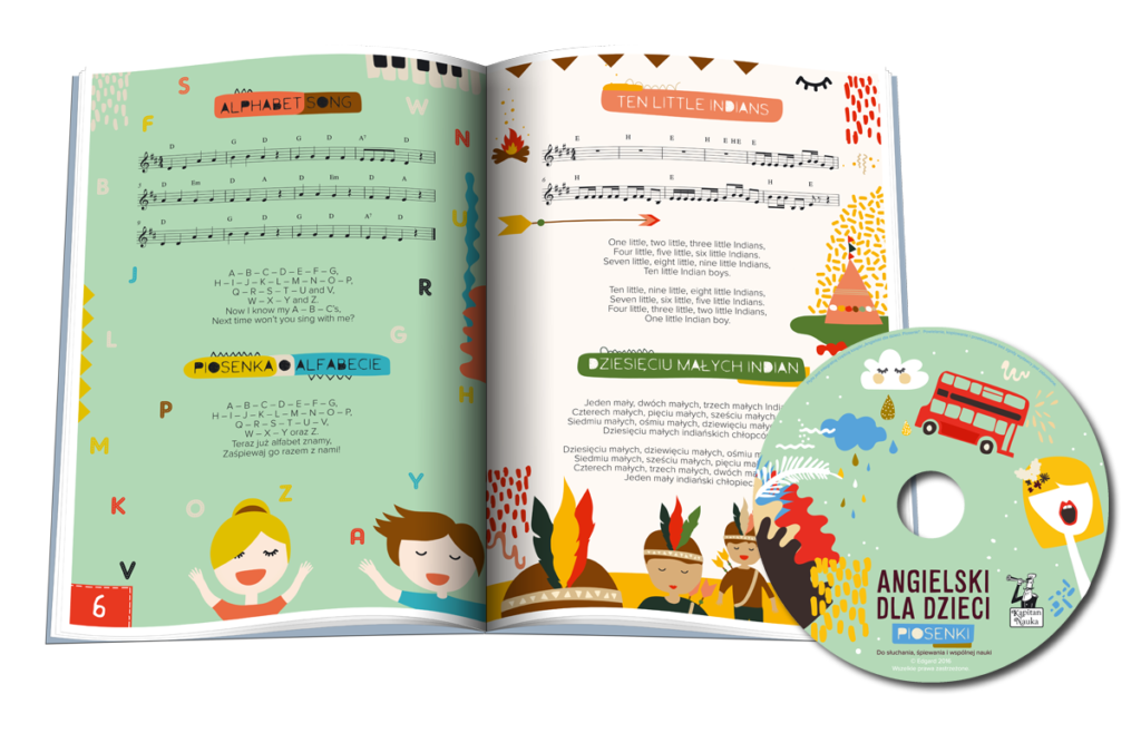 Angielski dla dzieci. Piosenki, książka wydana w ramach edukacyjnej serii Kapitan Nauka, zawiera 15 melodyjnych i łatwych do zaśpiewania popularnych utworów angielskich dla dzieci w wieku od 3 do 7 lat. Dzięki nagraniom na płycie audio w wykonaniu Juliette Edwins, 8-letniej Brytyjki, której towarzyszy tata, wspólne śpiewanie będzie jeszcze przyjemniejsze!