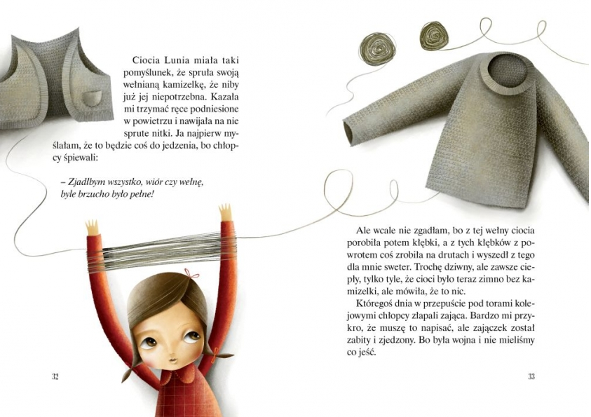 ,,Kiedy rozpoczęły się walki miała zaledwie pięć lat, akurat obchodziła urodziny ciesząc się z licznych prezentów otrzymanych od jej bliskich. Jeszcze nie wiedziała, że już wkrótce zostaną rozdzieleni i że niektórych z nich utraci na zawsze. Tego dnia ważny był dla niej nowy ołówek, gumka, zeszyt do rysunków oraz czarodziejska kredka, której jeden koniec pisał na czerwono, a drugi na niebiesko. Jednego dnia była szczęśliwa, a drugiego rozpoczęła się jej tułaczka z domu do domu, gdzie zupełnie obcy ludzie starali się otoczyć ją opieką i zapewnić bezpieczeństwo. I choć po wojnie ponownie połączyła się z większością rodziny, wydarzenia tamtych czasów zostały w jej pamięci już na zawsze.'' - http://magicznyswiatksiazki.pl