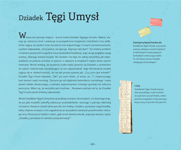 Są Dziadkowie, którzy mają kieszenie pełne całusków, landrynek i niesamowitych opowieści. Są Dziadkowie, którzy żeglują po bajkach jak po falach na grzbiecie wieloryba. Są i tacy, co wstają skoro świt, nim zadzwoni budzik, by prowadzić wnuki do szkoły w rytmie cza-czy. Prawie wszyscy Dziadkowie zapomnieli na jakiś czas o dziecku, które nosili w sobie, by na moment stać się odpowiedzialnymi ojcami. Wystarczy jednak, że w ich życiu pojawi się pierwszy wnuk, a w okamgnieniu wracają do krainy dzieciństwa.