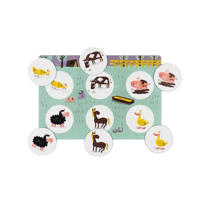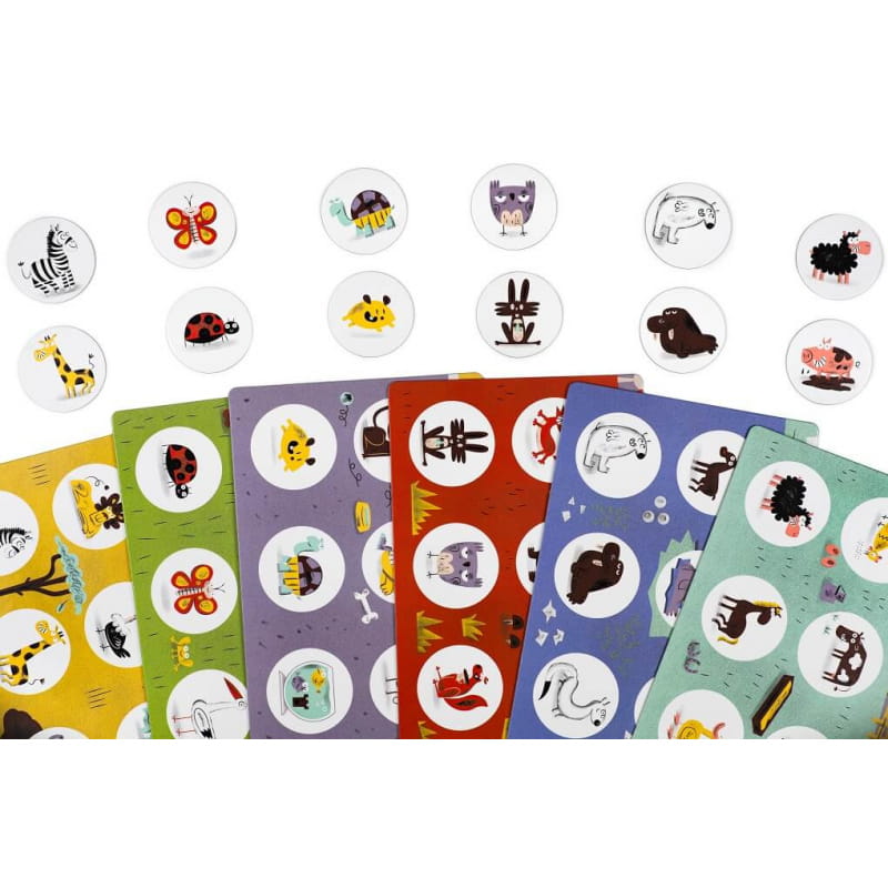W zestawie znajduje się 6 plansz i 36 żetonów. Trwałe, wykonane z grubej tektury elementy są idealne już dla dwulatków.