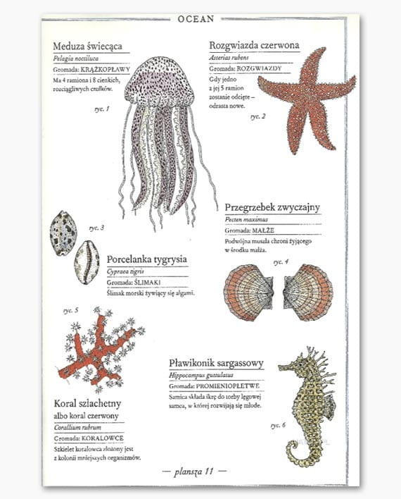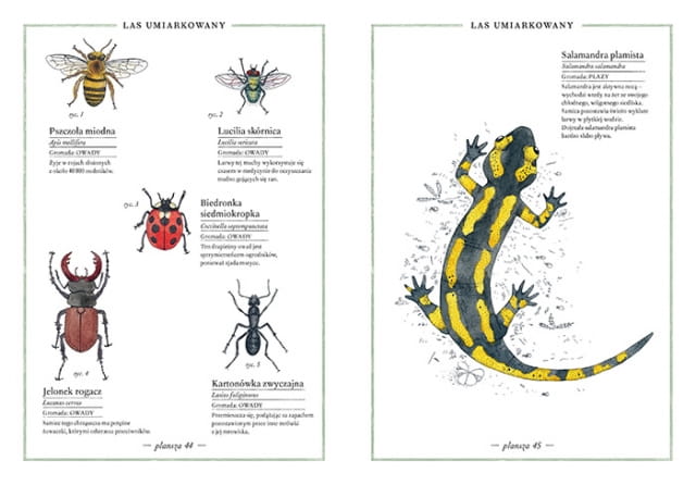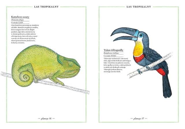 Czarne kontury rysunków wykonała rapidografem i tuszem chińskim. Do kolorowania użyła akwareli, które nakładane z różną intensywnością, świetnie oddają bogactwo odcieni i faktur spotykanych w przyrodzie. Każda rycina opatrzona jest polską i łacińską nazwą oraz kilkoma ciekawostkami na temat zwierzęcia.