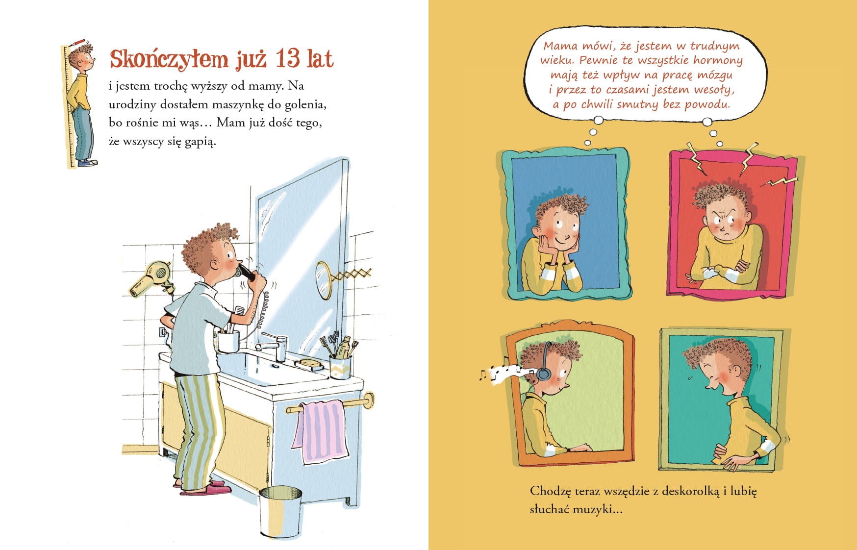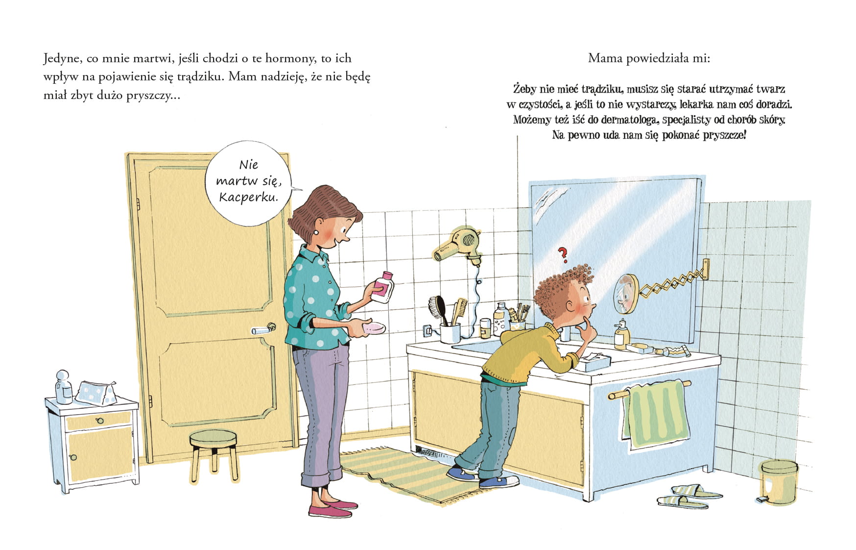 Kacper ma dziewięć lat i ze zdumieniem stwierdza, że coś w jego ciele zaczyna się zmieniać. Czyżby dojrzewał? Martwi go fakt, że jeszcze nie urósł (dziewczynki z jego klasy są już takie wysokie!), boi się nadmiaru pryszczy (mama radzi utrzymywać twarz w czystości) oraz dziwi się swoim zmianom nastrojów (ponoć to przez hormony). Najchętniej cały dzień słuchałby muzyki i jeździł na deskorolce.