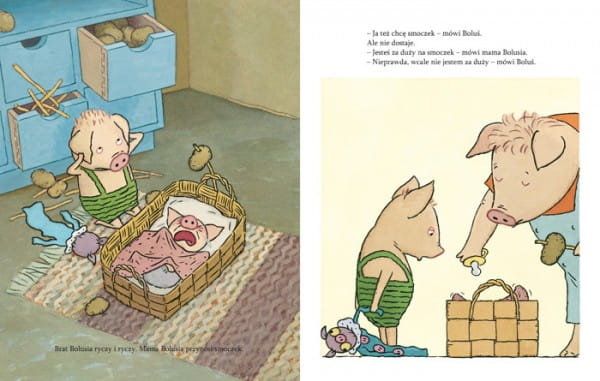 Bolusiowi urodził się braciszek. Boluś chciał. No i ma. Braciszek całymi dniami ssie smoczek. A Bolusiowi nawet nie wolno spróbować. Ma już dość braciszka. Wolałby smoczek.