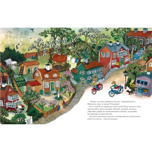 Lotta nie może już patrzeć na swój trzykołowy rowerek, chce mieć prawdziwy duży rower, taki jaki mają Jonas i Mia-Maria! Jest tak rozżalona, że wykrada z szopy cioci Berg stary rower i udaje, że potrafi na nim jeździć. Rower jest jednak dla niej zdecydowanie za duży, a ulica Awanturników zdecydowanie za stroma…