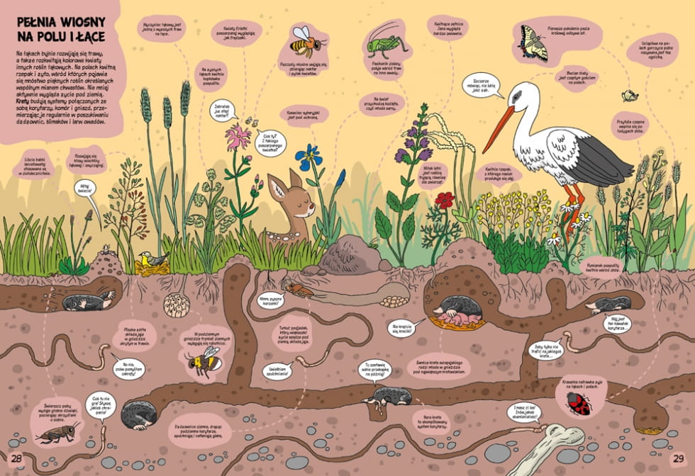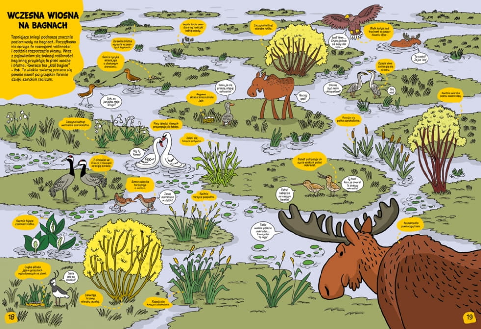 Gdzie na świat przychodzą młode wilki, jak wyglądają podziemne korytarze kreta, co robi wydra w wodzie, jak wygląda życie nietoperzy w ciemnej jaskini. Kto składa zielone jaja, które zwierzęta hibernują, kto jest królem bagien. O czym rozmawiają zwierzęta, o co się kłócą i co je bawi. Bogactwo informacji, szczegółów i ciekawostek przyrodniczych w doskonałej formie rysunkowej. W „dymkach“ przezabawne wypowiedzi zwierząt.