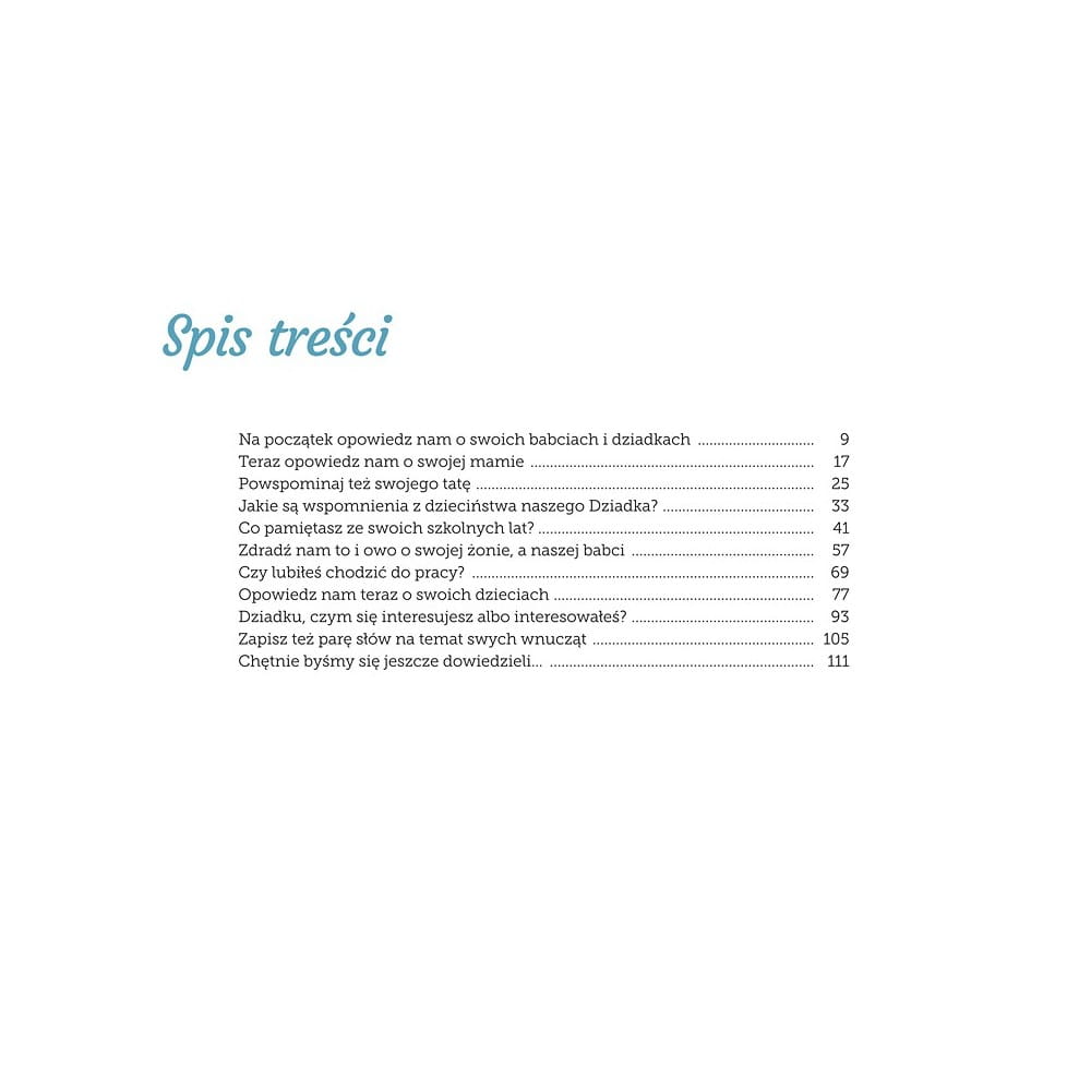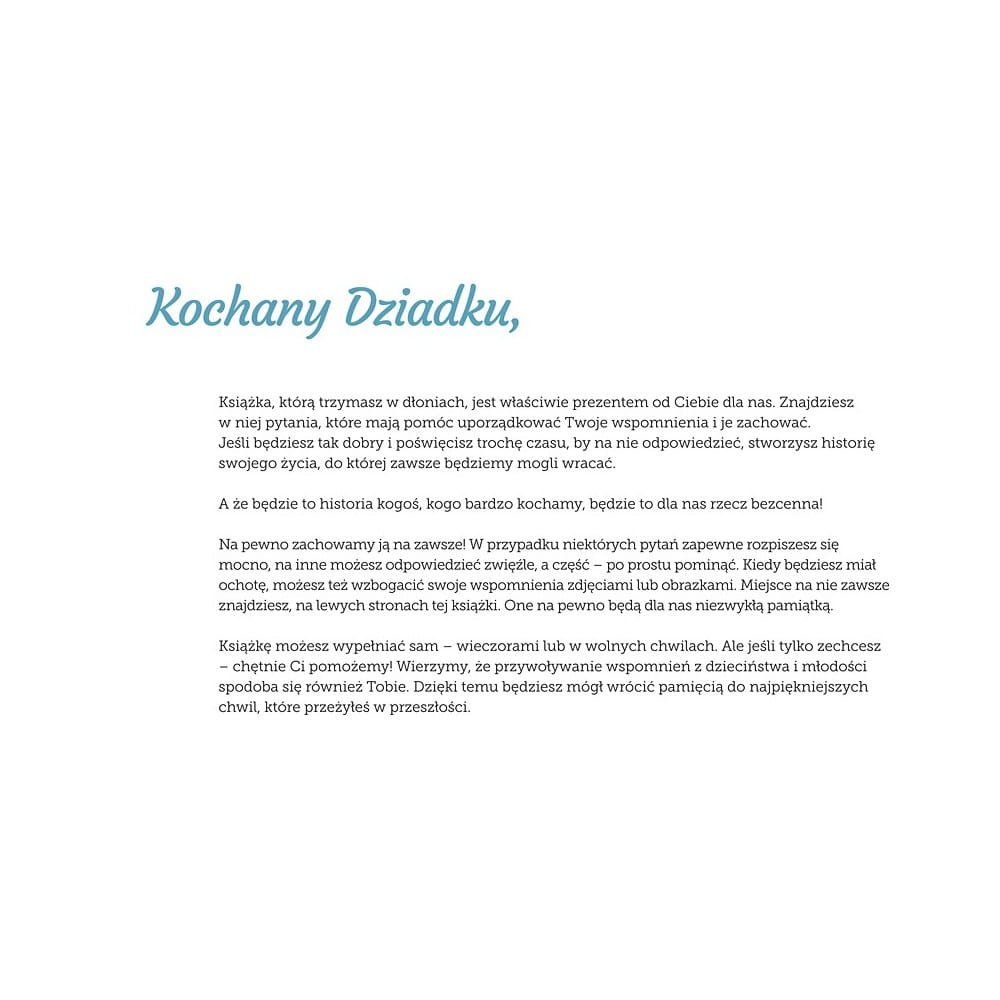 Książka ta służy do spisywania wspomnień waszego dziadka od jego dzieciństwa do chwili obecnej. Dziadek będzie mógł ją zapełnić samodzielnie lub z pomocą wnuków. Na jej stronach jest szereg pytań, które pozwolą poznać lepiej dziadka i jego życie. Ta książka stanie się dla niego świetną zabawą, a dla całej rodziny cennym skarbem.