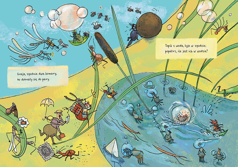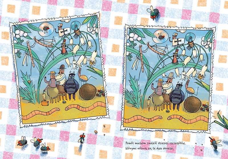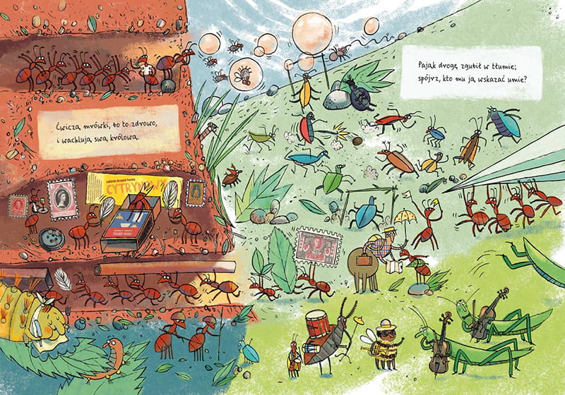 Książka opowiada o pająku Kleofasie, który żegna się z rodzicami i rodzeństwem, by wyruszyć w świat. Historia o pająkach pomoże nam wszystkim, niezależnie od wieku, oswoić się z tymi zwierzętami – jeśli mają imiona i swoich bliskich, trudniej się ich bać, trudniej ich nie lubić. Gdy będziemy razem czytać i oglądać tę książkę, wspólnie rozwiązywać wierszowane zagadki, możemy zachęcać dziecko, by samo zaczęło opowiadać: co wydarzyło się na obrazku, co i dlaczego robią zwierzęta. Takie opowiadanie uruchamia wyobraźnię, ćwiczy zdolność twórczego rozwiązywania problemów i pobudza rozwój mowy. Oprócz historii Kleofasa jest tu jeszcze kilka innych wątków do wykorzystania, np. przygody trzmiela czy żuka gnojowego. Pojawiają się też mrówki, bohaterki pierwszej książki z tej serii.