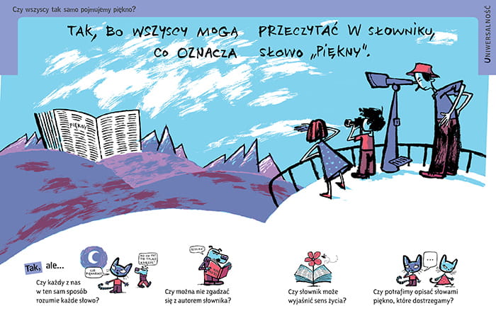 Charakterystyczne ilustracje oparte na koncepcji żartu rysunkowego pomagają spojrzeć na omawiany problem w sposób humorystyczny, delikatny, poetycki czy nawet nieco wywrotowy - wszak myślenie to świetna zabawa!