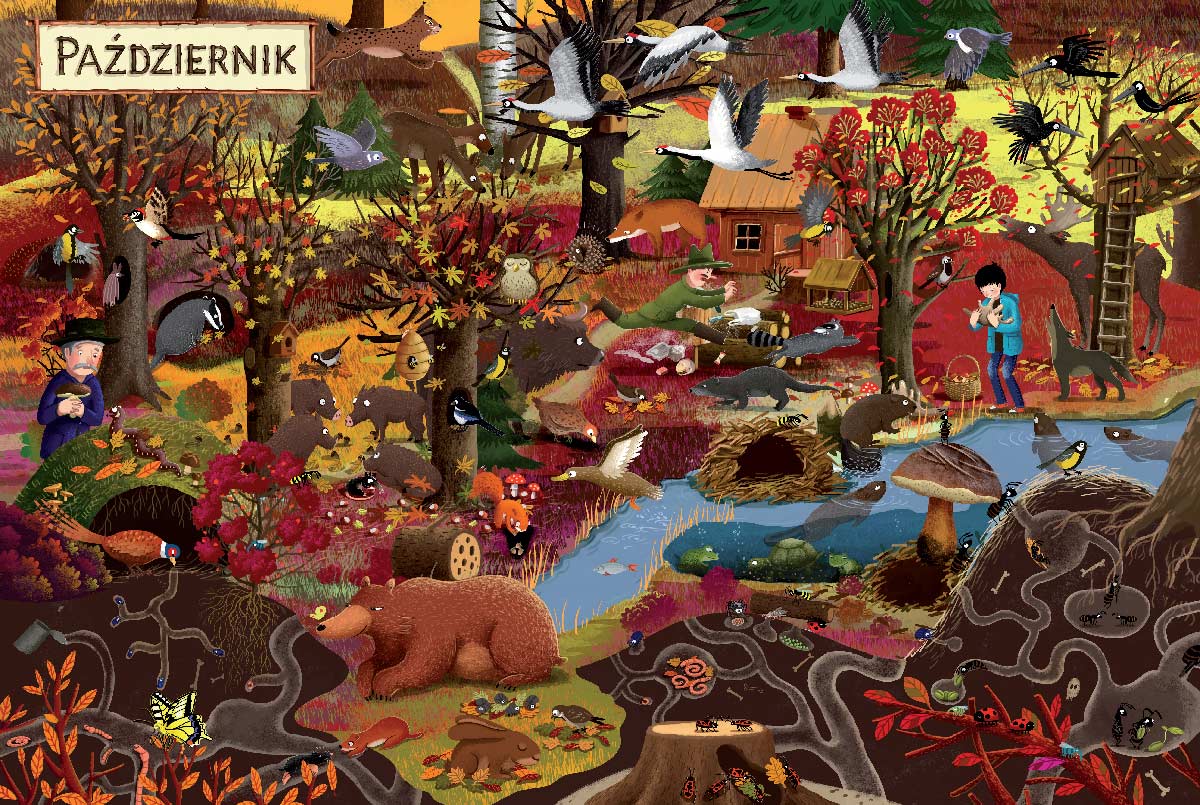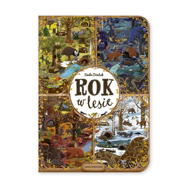 Poszukajcie odpowiedzi na kartach tej niezwykłej książki. „Rok w lesie”zawiera dwanaście rozkładówek z kolejnymi miesiącami jednego roku. Każdy miesiąc to ten sam szczegółowo rozrysowany kadr lasu z mieszkańcami pokazanymi w innych sytuacjach, warunkach pogodowych, w innej porze dnia lub nocy. Dwie dodatkowe rozkładówki zawierają prezentację bohaterów i interaktywną zabawę. „Rok w lesie”można oglądać godzinami. Ta niezwykła książka pobudza wyobraźnię, rozwija spostrzegawczość, zdolność logicznego myślenia, szukania związków przyczynowo-skutkowych, umiejętność opowiadania, a przede wszystkim gwarantuje świetną zabawę.