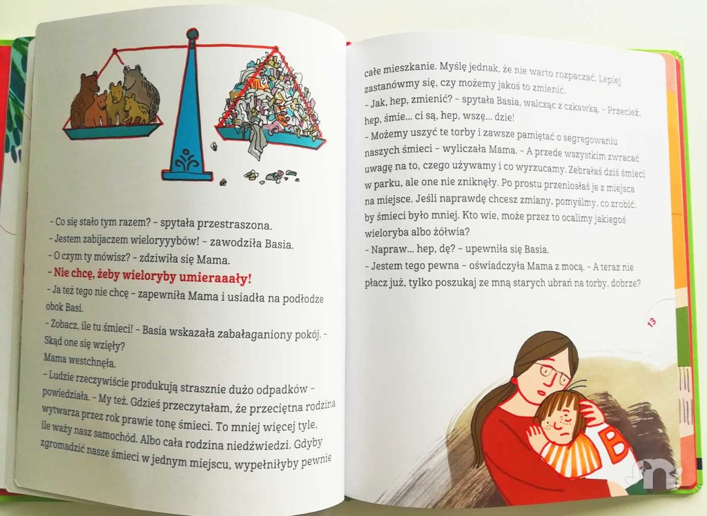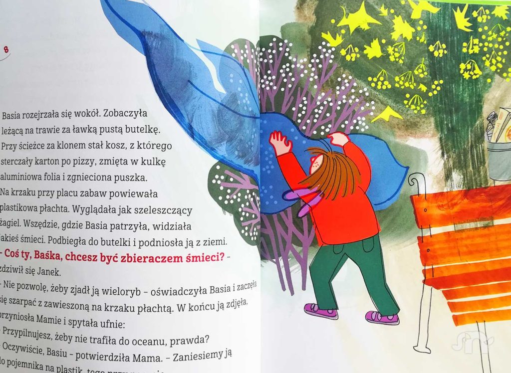 Zaśmiecanie środowiska to przewodni temat w nowej książce Marianny Oklejak i Zofii Staneckiej. Symbolem troski o planetę staje się wieloryb. Basia przejęta losem tych olbrzymich zwierząt martwi się o to, że masa śmieci ląduje w oceanach. Wieloryby oraz inne morskie zwierzęta zjadają odpady, które mogą powodować ich śmierć. I odpowiedzialny za to jest każdy z nas, ponieważ każdy człowiek produkuje śmieci w ilościach, które mogą szokować. Basia podsuwa też dzieciom pomysły co mogą zrobić, by wpływać realnie na losy Ziemi.